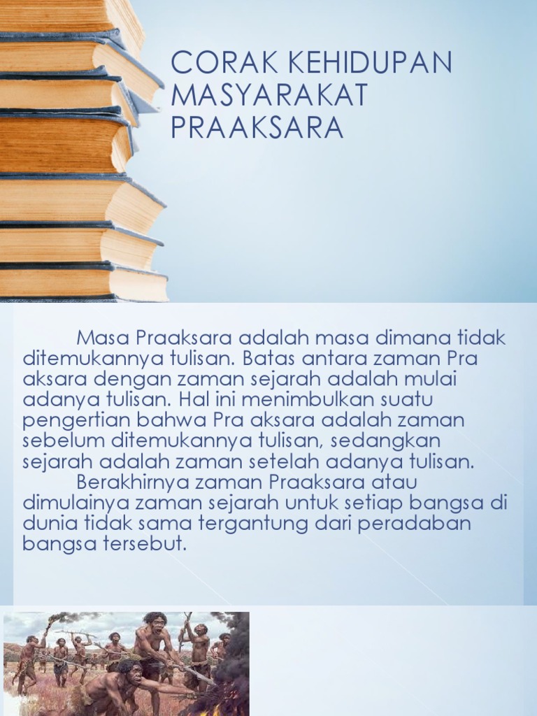 Corak kehidupan Masyarakat Masa Pra-aksara. Bacalah versi online KEHIDUPAN MASA PRAAKSARA tersebut. Corak kehidupan manusia berlangsung dari cara yang paling sederhana hingga pembuatan alat alat yang berasal dari logam.